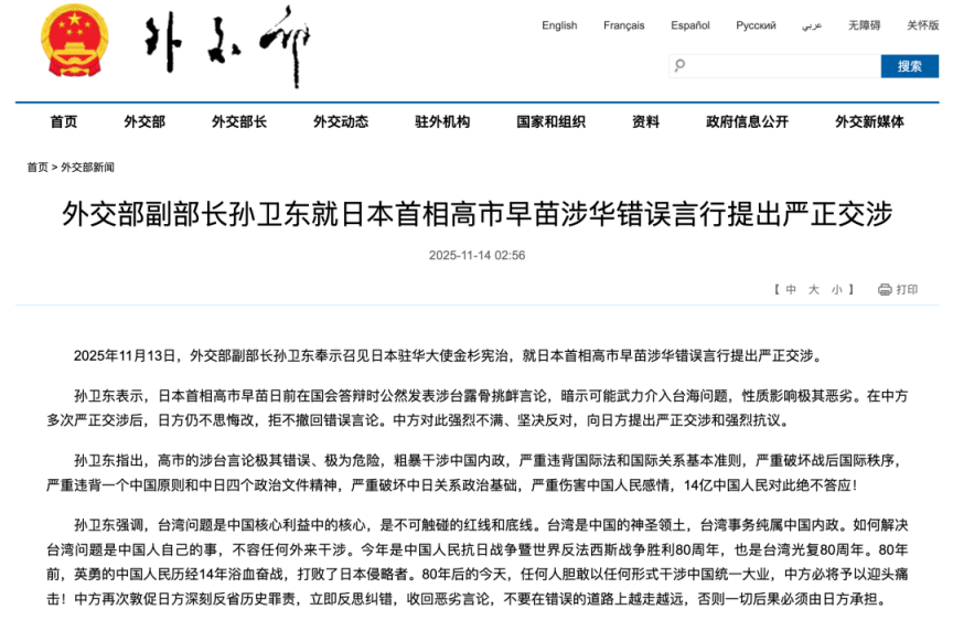 孙卫东指出,高市的涉台言论极其失实、极为危急,调皮干预中国内务,严重违背外洋法和外洋干系基本准则,严重轻率战后外洋规律,严重违背一个中国原则和中日四个政事文献精神,严重轻率中日干系政事基础,严重伤害中国东谈主民情谊,14亿中国东谈主民对此毫不搭理!