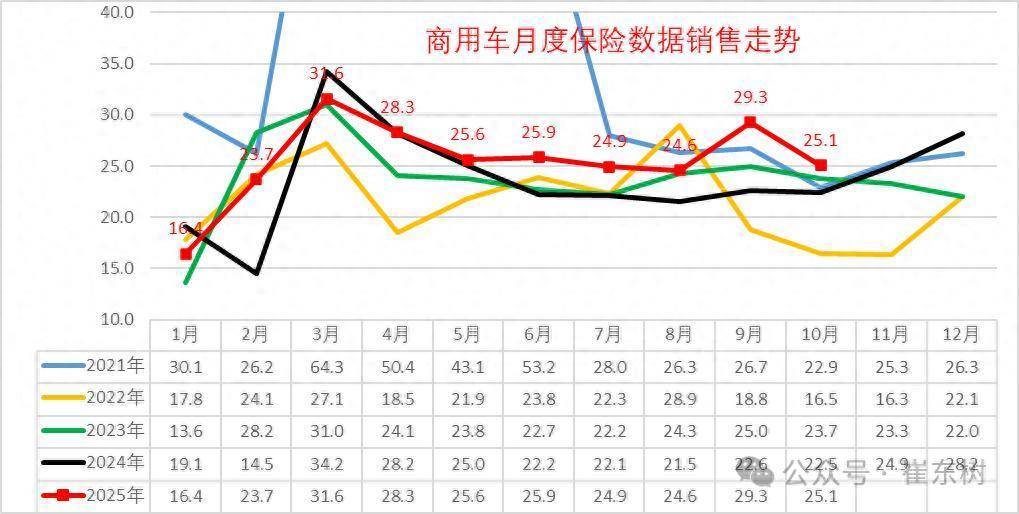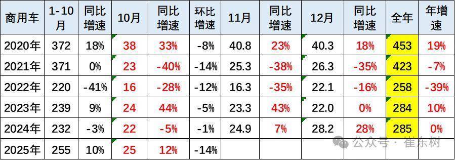 10月商用车国内销量终了25万台,同比增12%,环比降14%。2025年1-10月商用车国内销量终了255万台,同比增长10%,相干于2022年以来的商用车沉稳期,本年创出近几年新高的高超水平。