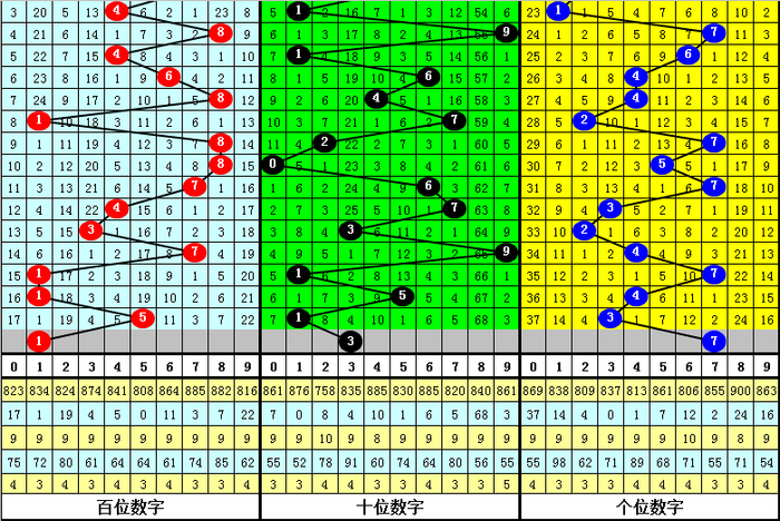 跨度:近5期跨度分布在1-6之间,振幅为6点,分布非常分散,上期跨度为4,重复出现,本期注意跨度走大,关注6区段。