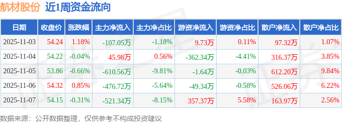 本站音尘,遏抑2025年11月7日收盘,航材股份(688563)报收于54.15元,较上周的53.61元飞腾1.01%。本周,航材股份11月6日盘中最高价报54.77元。11月3日盘中最廉价报53.15元。航材股份现时最新总市值243.68亿元,在航空装备板块市值名次14/46,在两市A股市值名次786/5166。