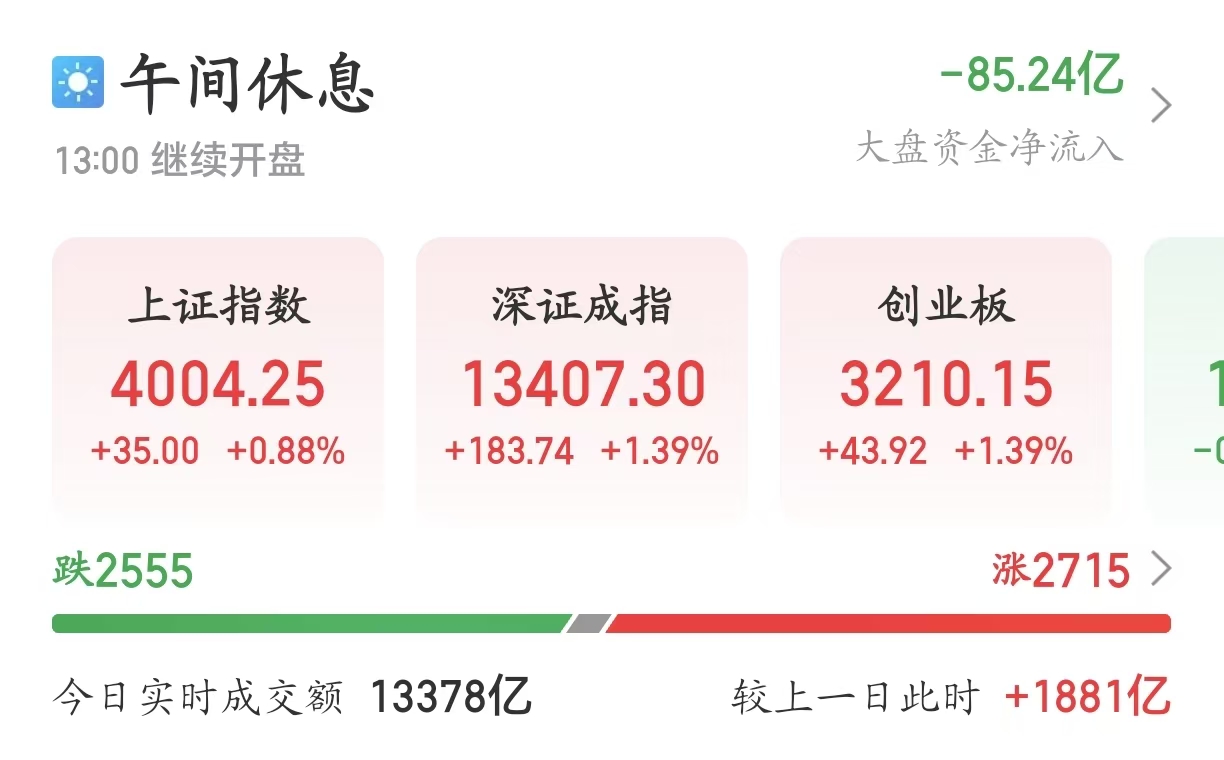京沪深三市半日成交额1.34万亿元,较上个来当年放量1881亿元。2715只个股飞腾,2555只个股着落。