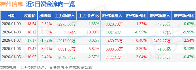 本站音尘,抛弃2026年1月9日收盘,神州信息(000555)报收于18.54元,飞腾2.32%,换手率12.33%,成交量119.85万手,成交额21.97亿元。