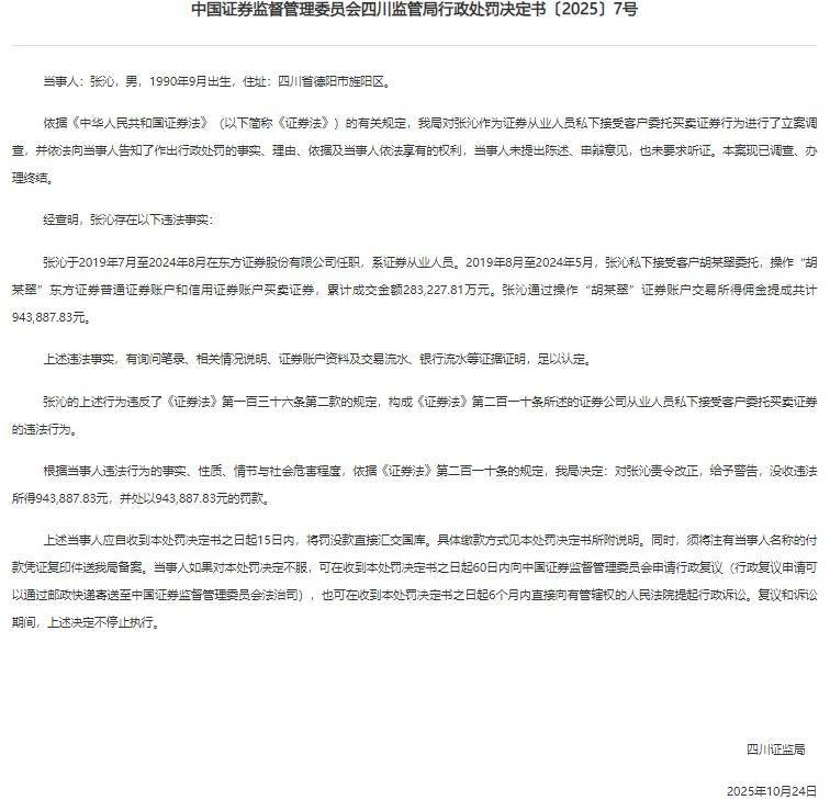 中国经济网北京11月7日讯 中国证券监督责罚委员会四川监管局网站昨日泄漏的行政处罚决定书〔2025〕7号裸露,经查明,张沁存在以下犯科事实:张沁于2019年7月至2024年8月在东方证券股份有限公司(证券简称“东方证券”,600958.SH、03958.HK)任职,系证券从业东谈主员。2019年8月至2024年5月,张沁擅自秉承客户胡某翠委用,操作“胡某翠”东方证券庸碌证券账户和信用证券账户商业证券,累计成交金额283,227.81万元。张沁通过操作“胡某翠”证券账户交游所得佣金提成悉数943,887.83元。