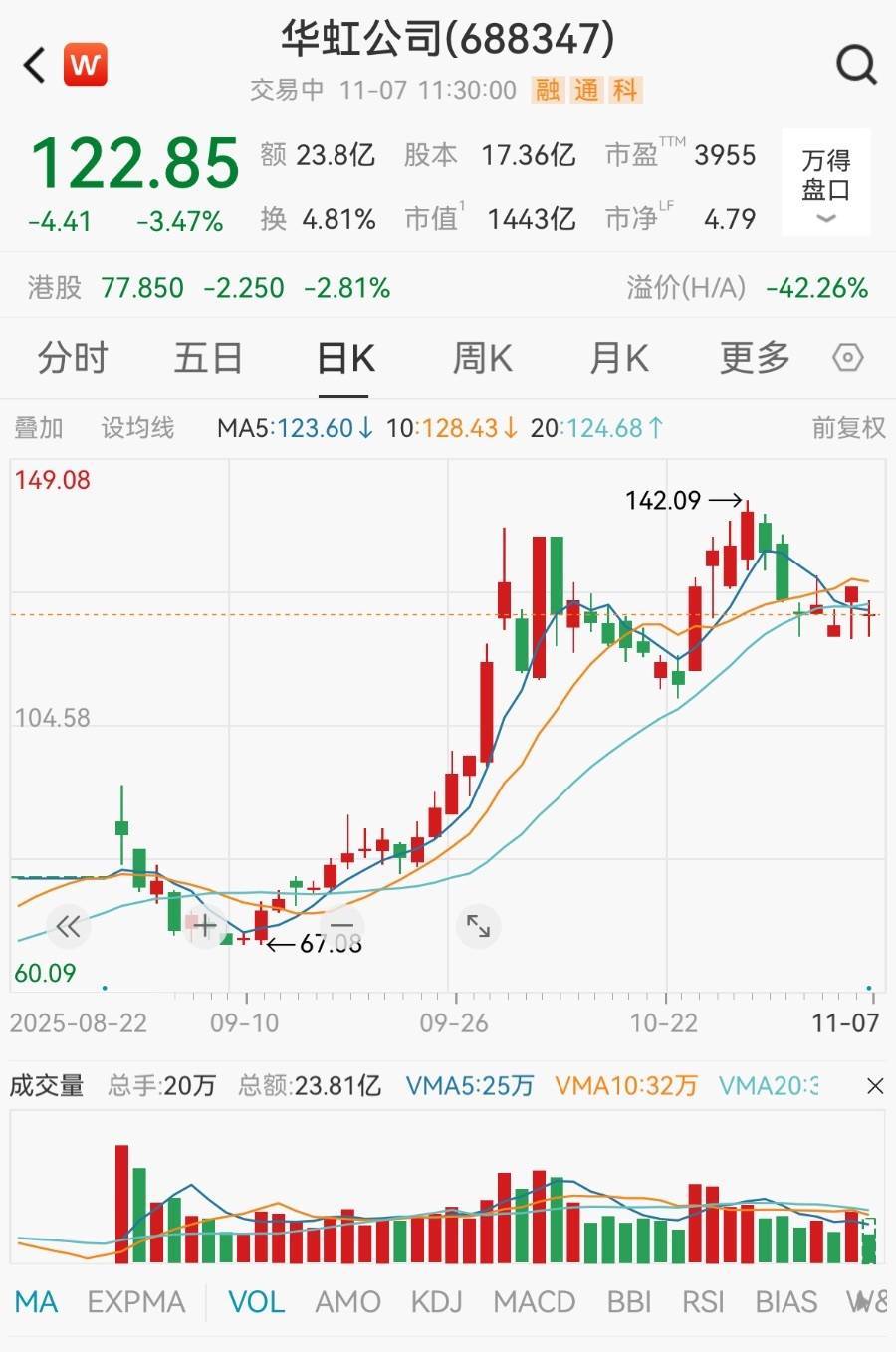 11月7日,芯片巨头华虹公司(688347.SH)股价盘中跌超6%,死心午间收盘,报122.85元/股,跌3.47%,总市值为1445亿元,较前一生意日挥发超40亿元,本年以来华虹公司股价涨超160%。